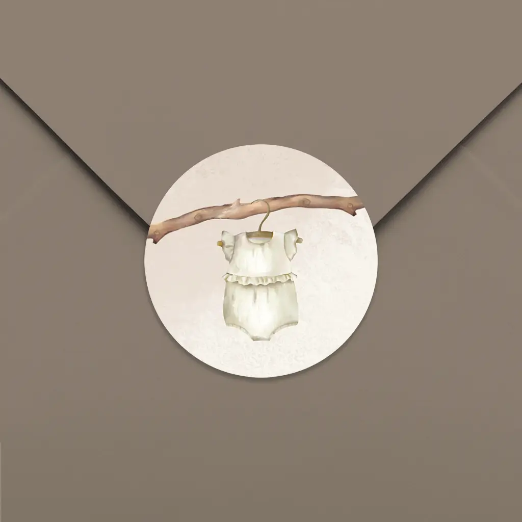 Een lieve sluitsticker voor bij het geboortekaartje van designer Studio Poppybird. Op het ontwerp van de sluitsticker staat een prachtige illustratie van een rompertje aan een houten tak. De achtergrond van de sticker heeft een watercolour structuur. De sticker maakt jullie geboorteaankondiging helemaal af. De sluitstickers hebben een diameter van 35 mm en worden geleverd op vellen van 25 stuks.