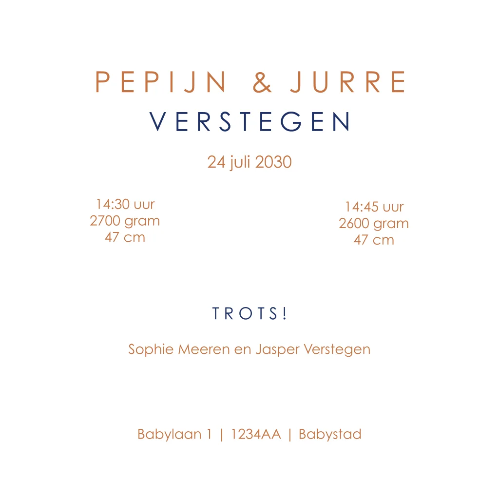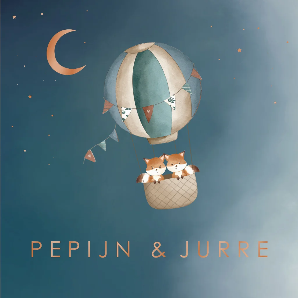 Een schattig geboortekaartje met een luchtballon die in onder een sterrenhemel vliegt. In de luchtballon zitten twee vosjes. De naam en verschillende details zijn gedrukt in hoogglans. Personaliseer dit kaartje voor jullie tweeling in onze handige online opmaaktool.Dit product maakt onderdeel uit van deze set.