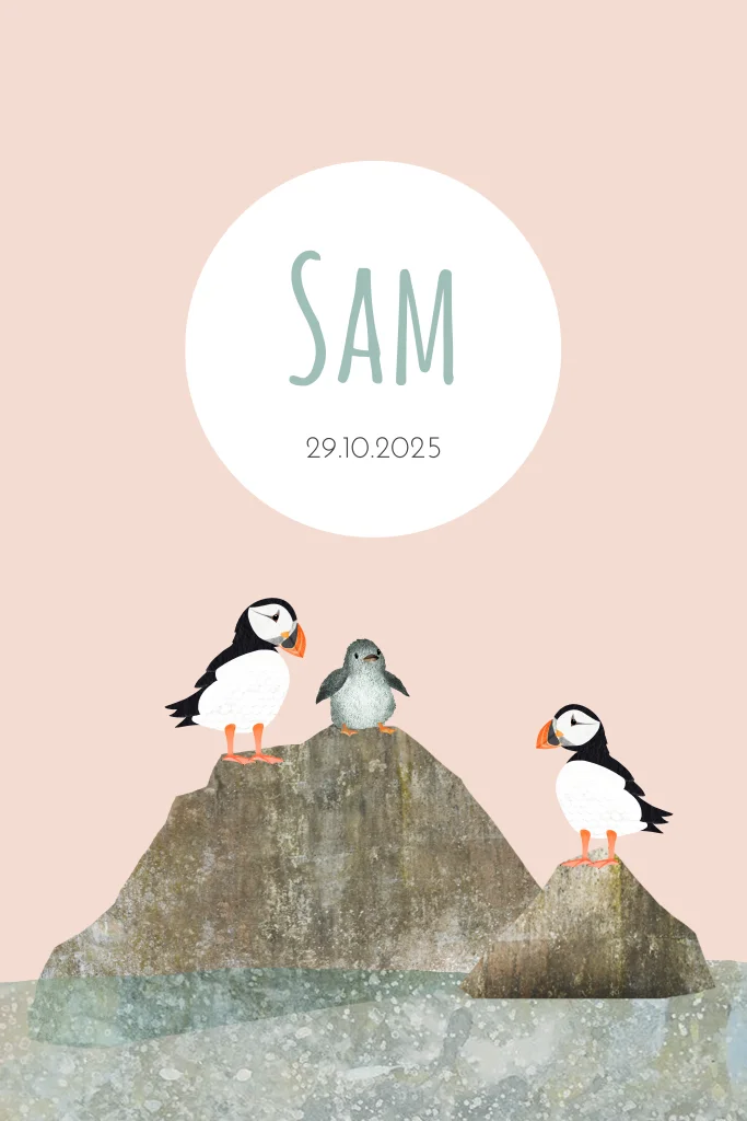Illustratief geboortekaartje van Studio Voorpret met twee ouderpapagaaien die met hun pluizige kleintje op de rotsen in het water staan. Met de zachtroze achtergrond heeft deze kaart een lieve en warme uitstraling. Leuk voor een zoon!