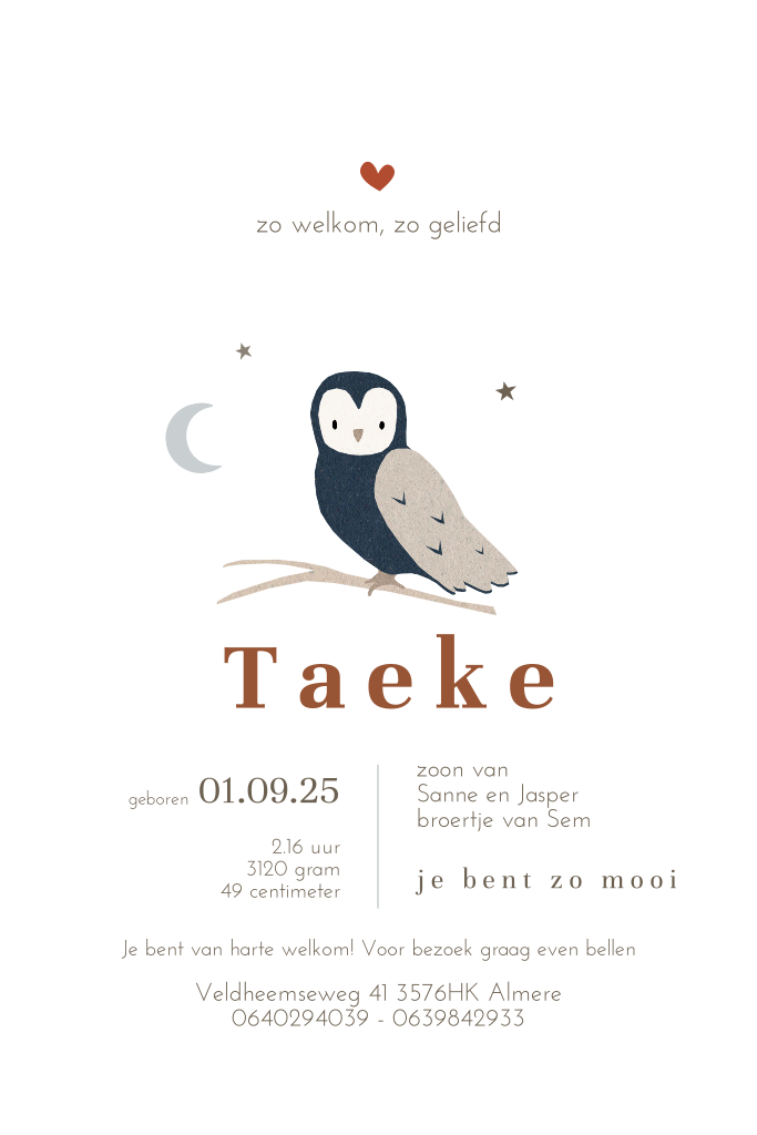 Origineel geboortekaartje met illustratie van een uiltje, maan en sterretjes. Het kaartje heeft een leuk typografisch ontwerp. De teksten op het kaartje kun je eenvoudig aanpassen in de online editor.