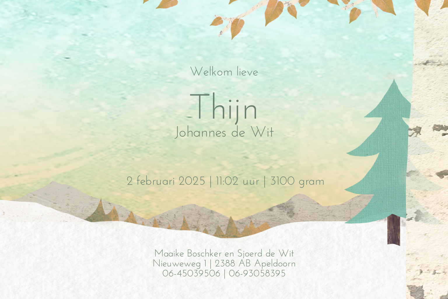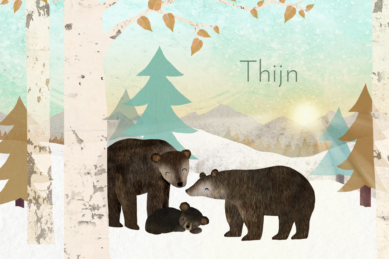 Verwachten jullie een zoontje in de winter? Misschien is dit lieve, winterse babykaartje met beren in de sneeuw iets voor jullie! Op het kaartje staan twee grote beren en een klein beertje tussen de bergen en bomen. Achter de bergen komt de zon op.