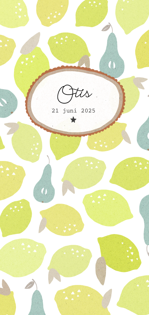 Hip zomer geboortekaartje voor jongetje met peren en citroenen