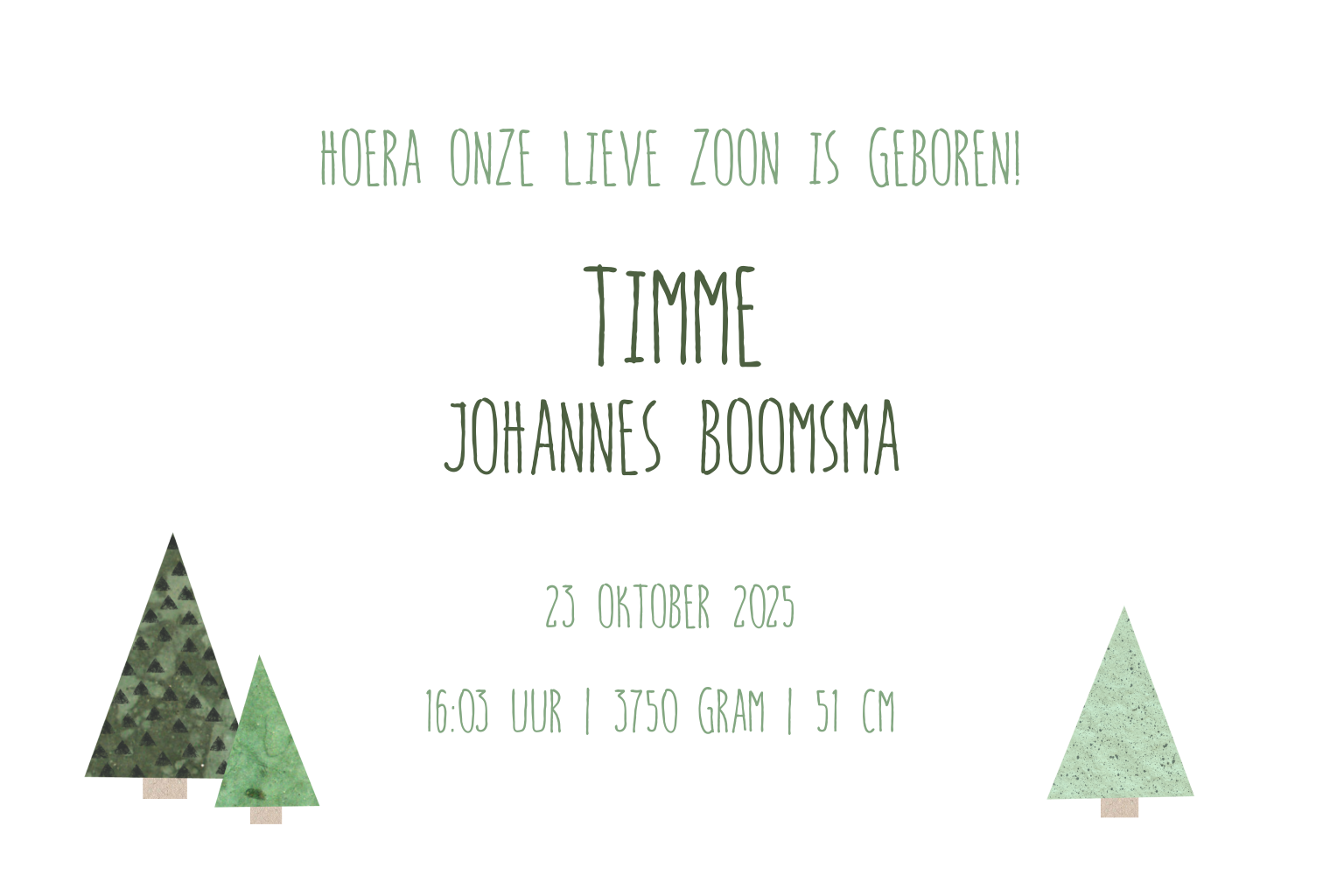 Dit frisse geboortekaartje past helemaal in de botanische trend! Pas eventueel het aantal boompjes, de grootte of de plaatsing naar eigen smaak aan. Dit kaartje is ook erg leuk met een bijpassende groene envelop!