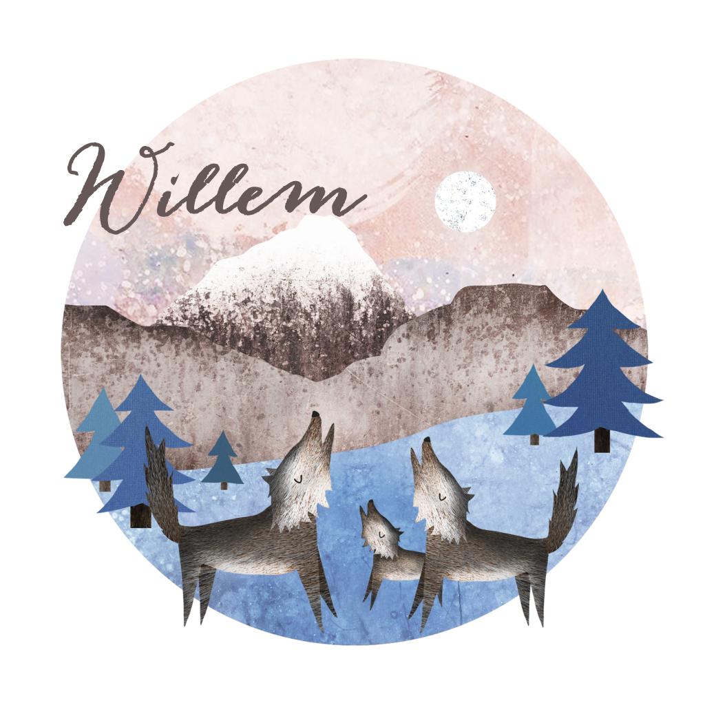 Dit geboortekaartje met wolven in de bergen in erg stoer voor een jongen! Studio Voorpret maakt prachtige illustraties en gebruikt verschillende technieken bij de tekeningen, wat een gaaf effect geeft!