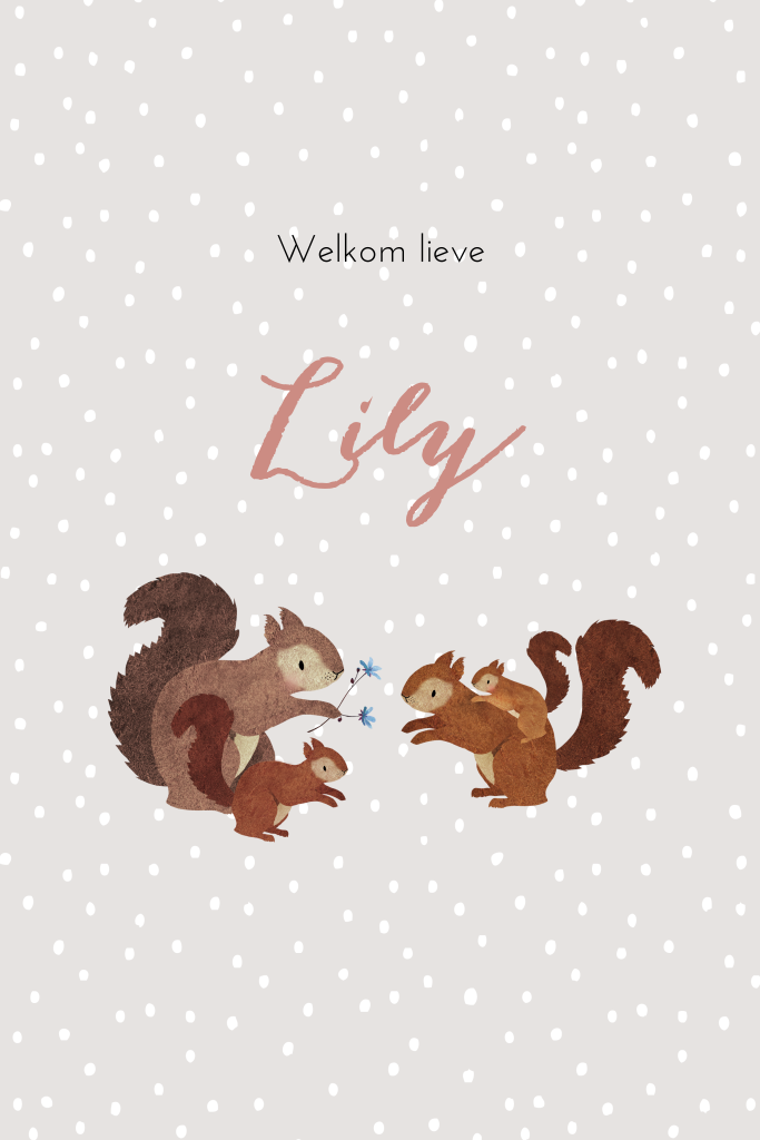 Hip babykaartje met stippenachtergrond en familie eekhoorn. Een lief kaartje van Studio Voorpret voor een meisje! Kleuren en lettertypes zijn naar wens aan te passen.