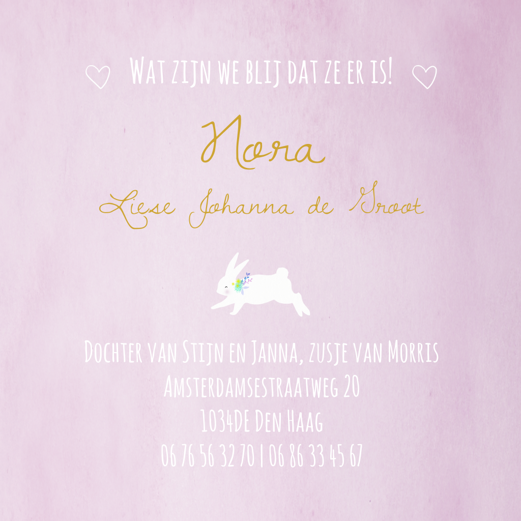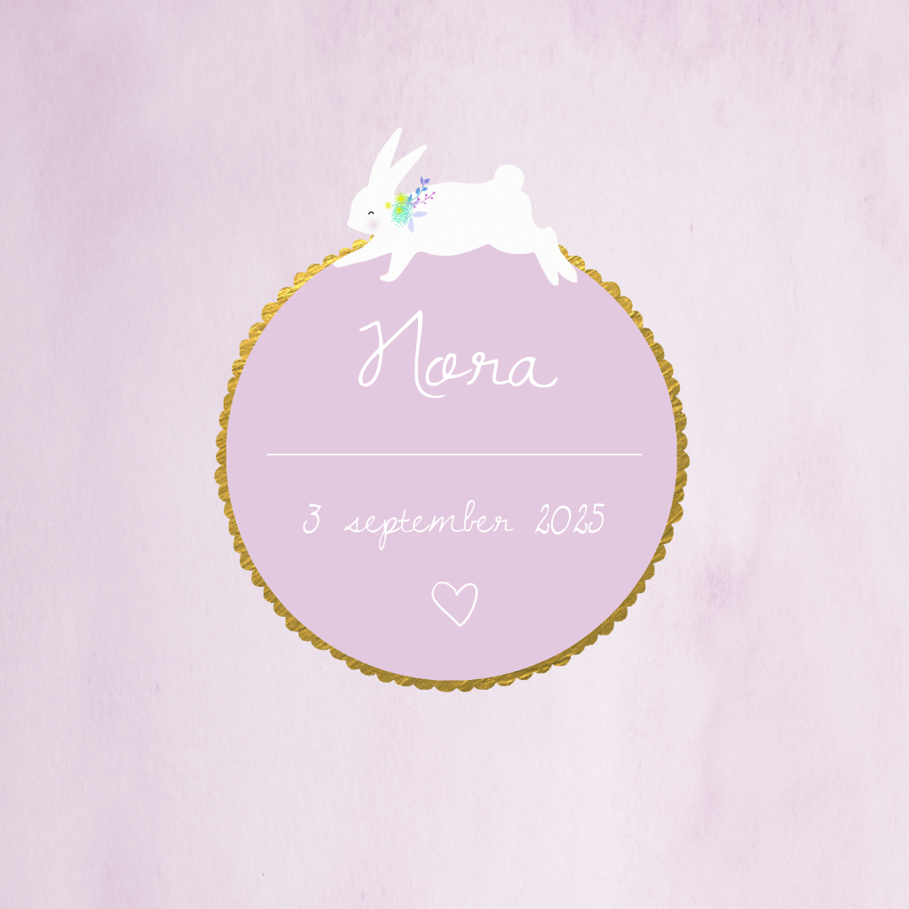 Lief geboortekaartje met konijntje en een rozet in goudlook op een paarse watercolour-achtergrond. Pas kleuren en typografie naar wens aan in de editor.