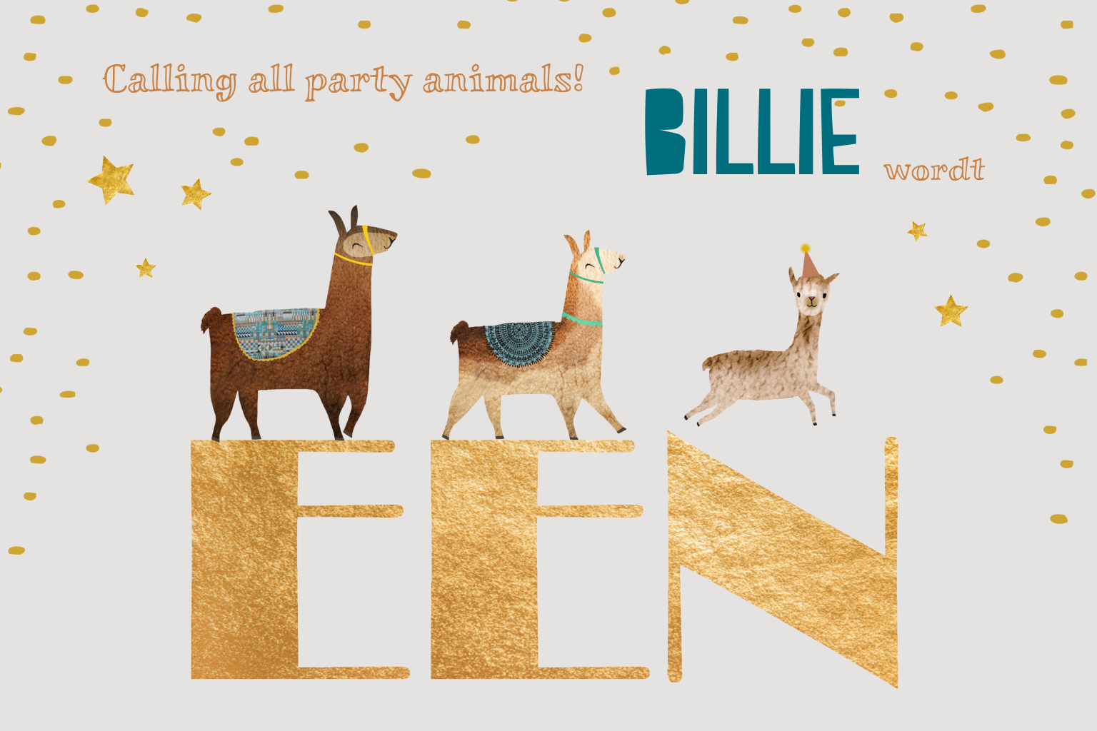 'Calling all party animals,' want er is een feestje voor een jongen van 1 jaar! Deze trendy uitnodiging heeft tekst in goudlook, vrolijke lama's en is rijkelijk versierd met goudkleurige stippen en sterren. Wanneer is jullie party?