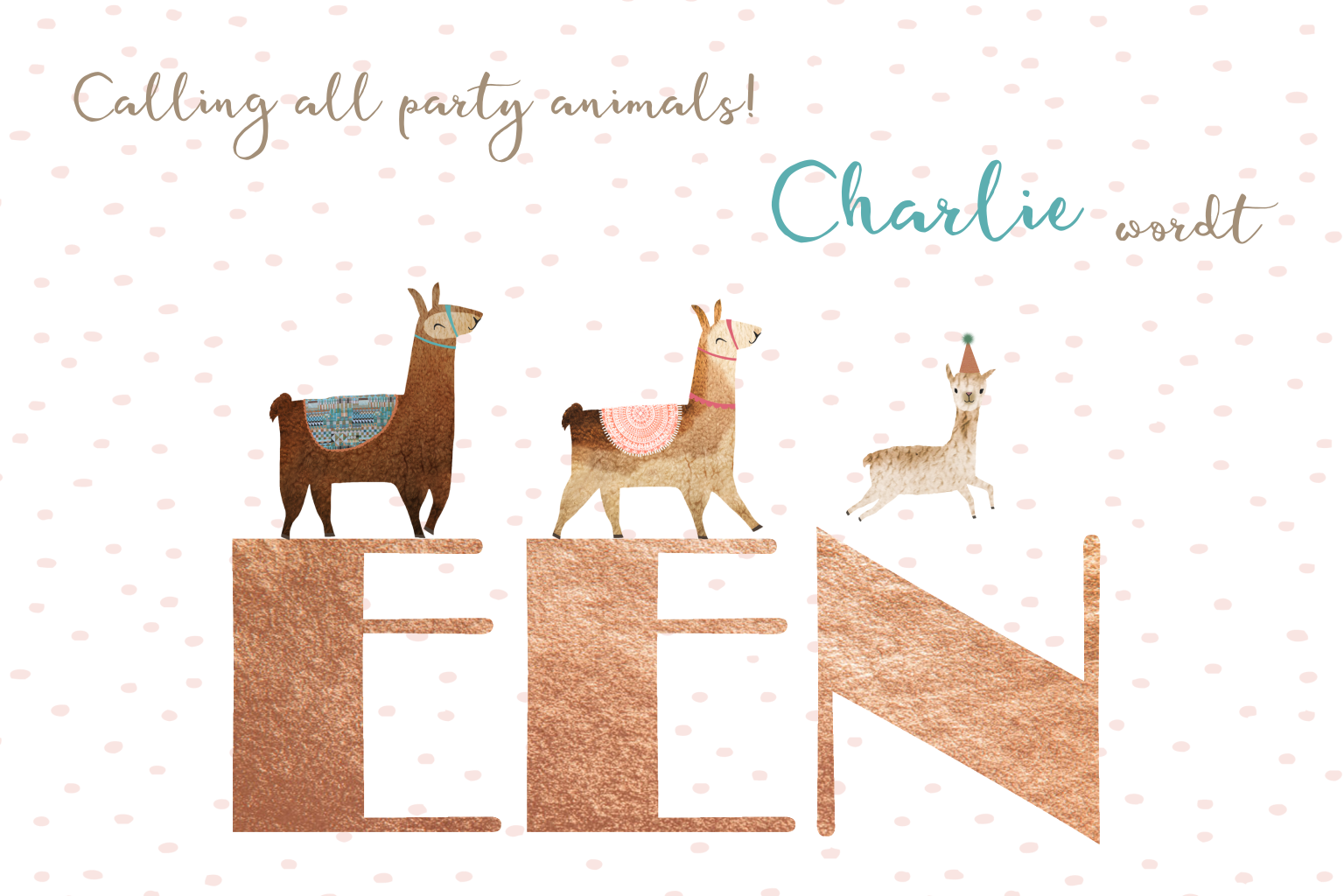 Wat een hippe uitnodigingskaart met leuke lama's en EEN in koperlook! Ook tof is de vrolijke achtergrond van roze stippen. Pas de teksten aan en maak een persoonlijke uitnodiging voor de eerste verjaardag van jouw meisje!