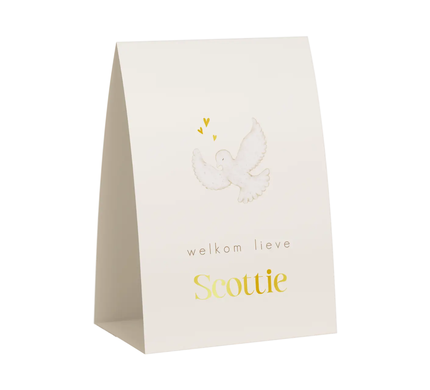 Tentkaartje geboortekaartje met een illustratie een duif. De letters en hartjes worden in goudfolie. De achtergrond en letters zijn volledig naar wens aan te passen in de editor.