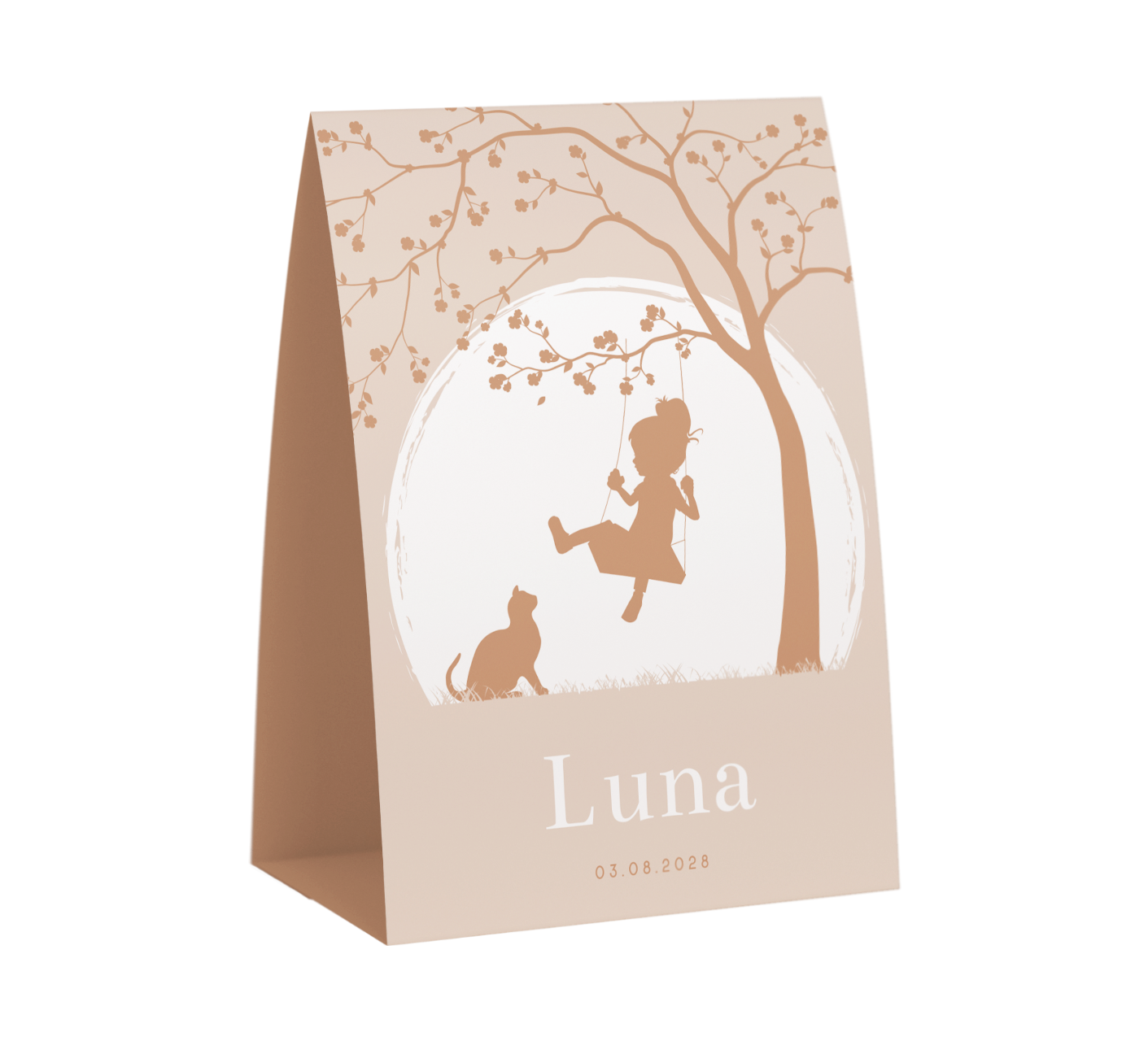 Lief tentkaartje met silhouet van meisje op schommel met kat