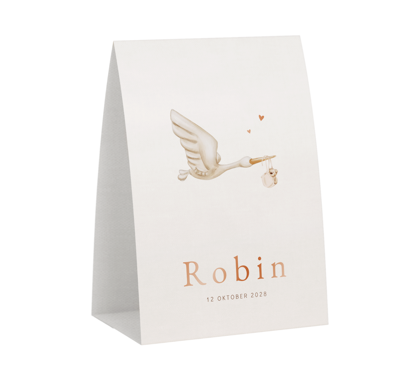Kondig de geboorte van je zoon of dochter aan met dit luxe tentkaartje. Op het kaartje is de illustratie van een ooievaar te zien. De naam en kleine hartjes worden gedrukt in koperfolie en geven dit kaartje een luxe uitstraling.