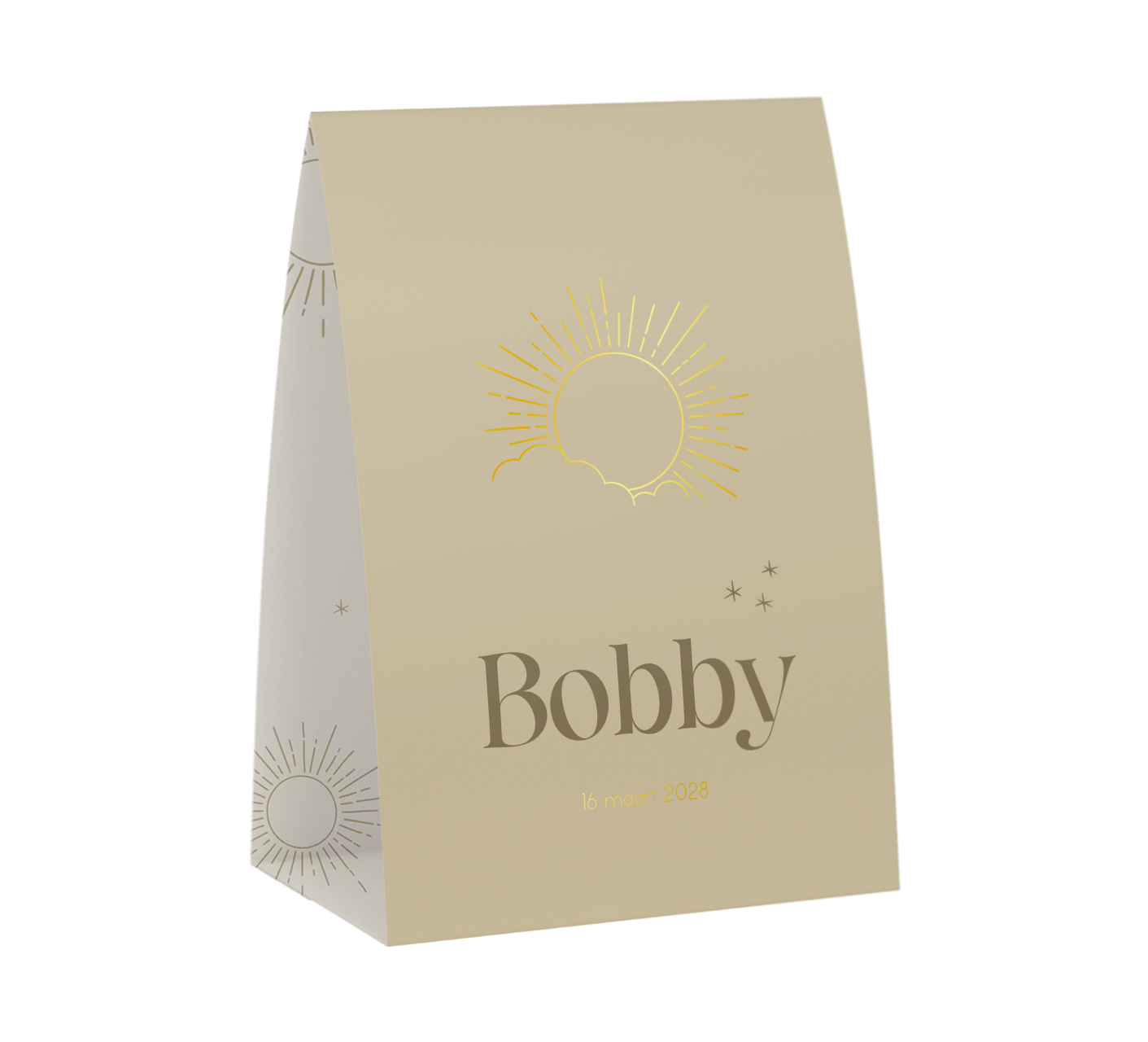 Kondig de geboorte van jullie kindje aan met dit originele tentkaartje. Op het kaartje staat een goudfolie lijntekening van een zon met daar onder een wolkje. De kaart heeft een beige achtergrond.