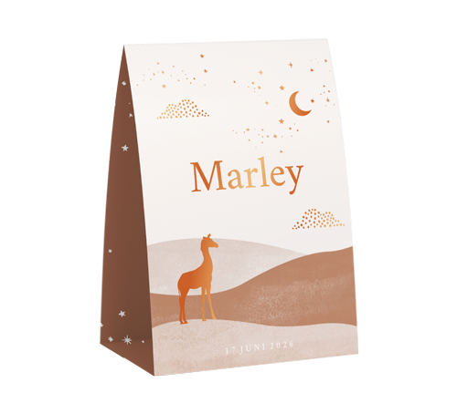 Een hoogglans tent geboortekaartje voor een meisje. Het kaartje heeft verschillende aardetinten en prachtige hoogglans details. Je ziet een bergen landschap met een giraf. Het kaartje is gemakkelijk zelf in elkaar te zetten.