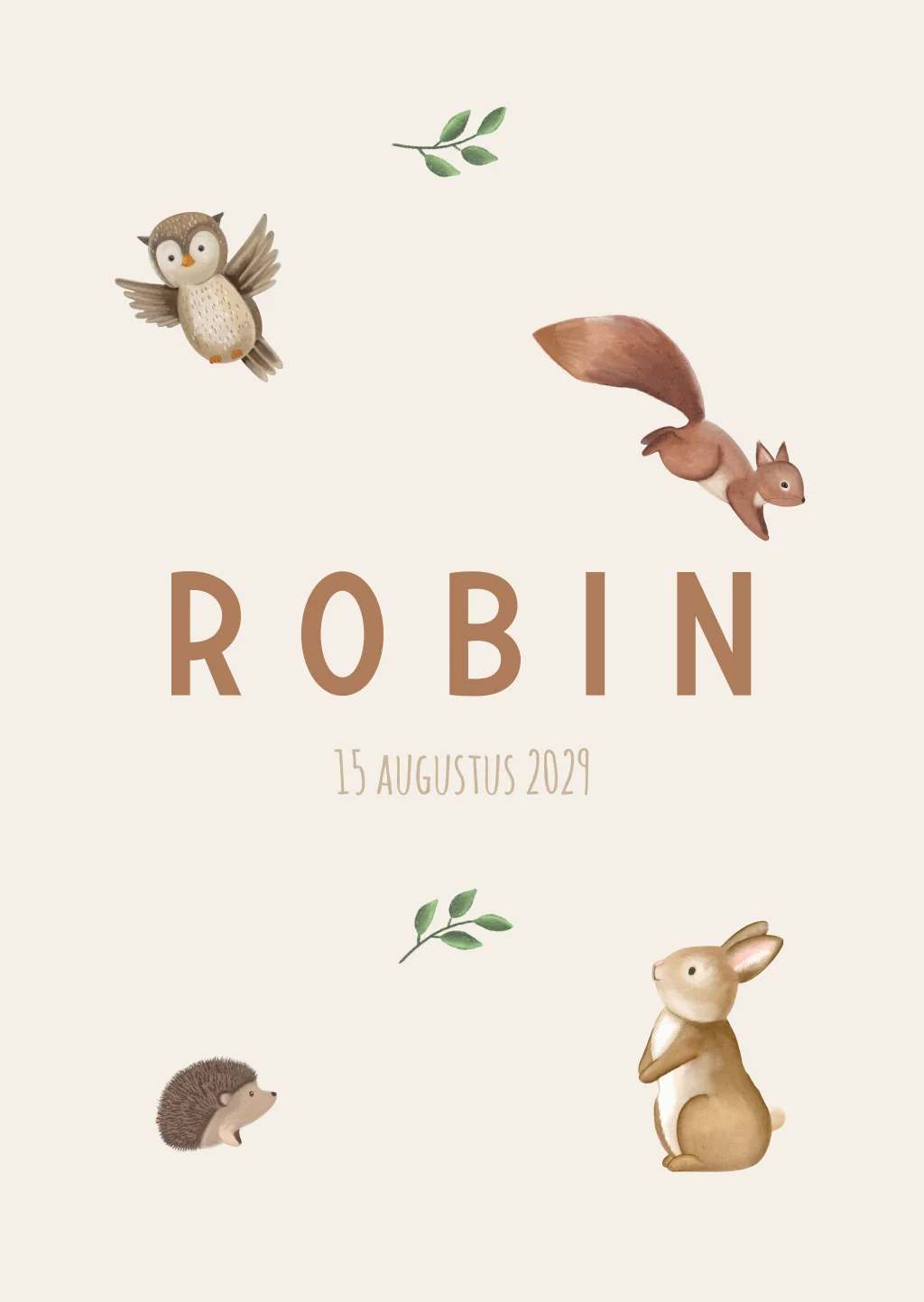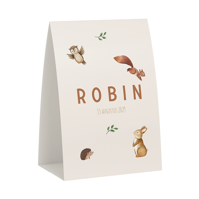 Dit lieve tentkaartje heeft een mooie lichte kleur met illustraties van verschillende schattige bosdieren. Het kaartje is naar wens aan te passen in onze online editor.