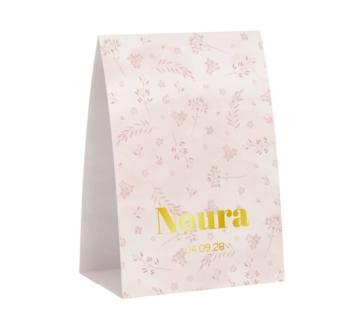 Een romantisch tentvorm geboortekaartje voor jouw dochter. Dit kaartje vouw je zo dat het een tentvorm heeft en kan blijven staan. Het bloemenpatroon kun je zelf een andere kleur geven, de naam en geboortedatum zijn hier gedrukt in goudfolie wat een prachtige glans geeft.