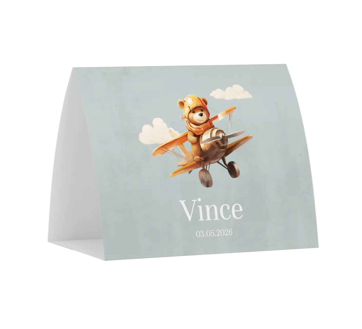Een vrolijk geboortekaartje voor jouw zoon. Het liggende tentkaartje heeft een blauwe achtergrond met daarop vrolijke illustratie van een beertje in een vliegtuig. Het kaartje kan je gemakkelijk zelf in elkaar zetten.