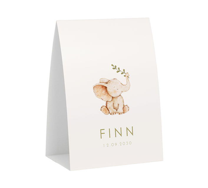Een warm en lief tentkaart geboortekaartje met een zachte uitstraling. Op de voorzijde staat een schattig beige olifantje, liefdevol getekend in aquarelstijl. Het olifantje houdt een klein groen takje vast.