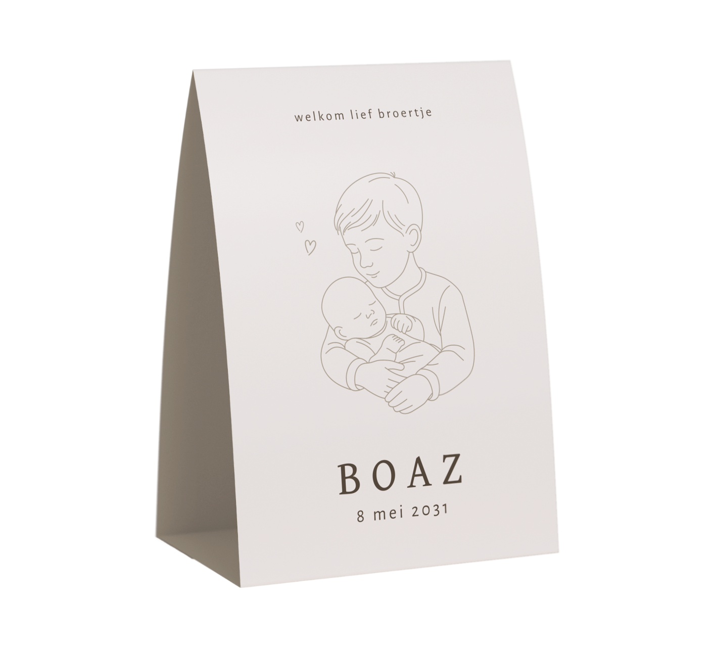Dit elegante tentkaartje heeft een zachte kleur met een lijntekening van een baby met grote broer. Het kaartje is naar wens aan te passen in onze online editor.