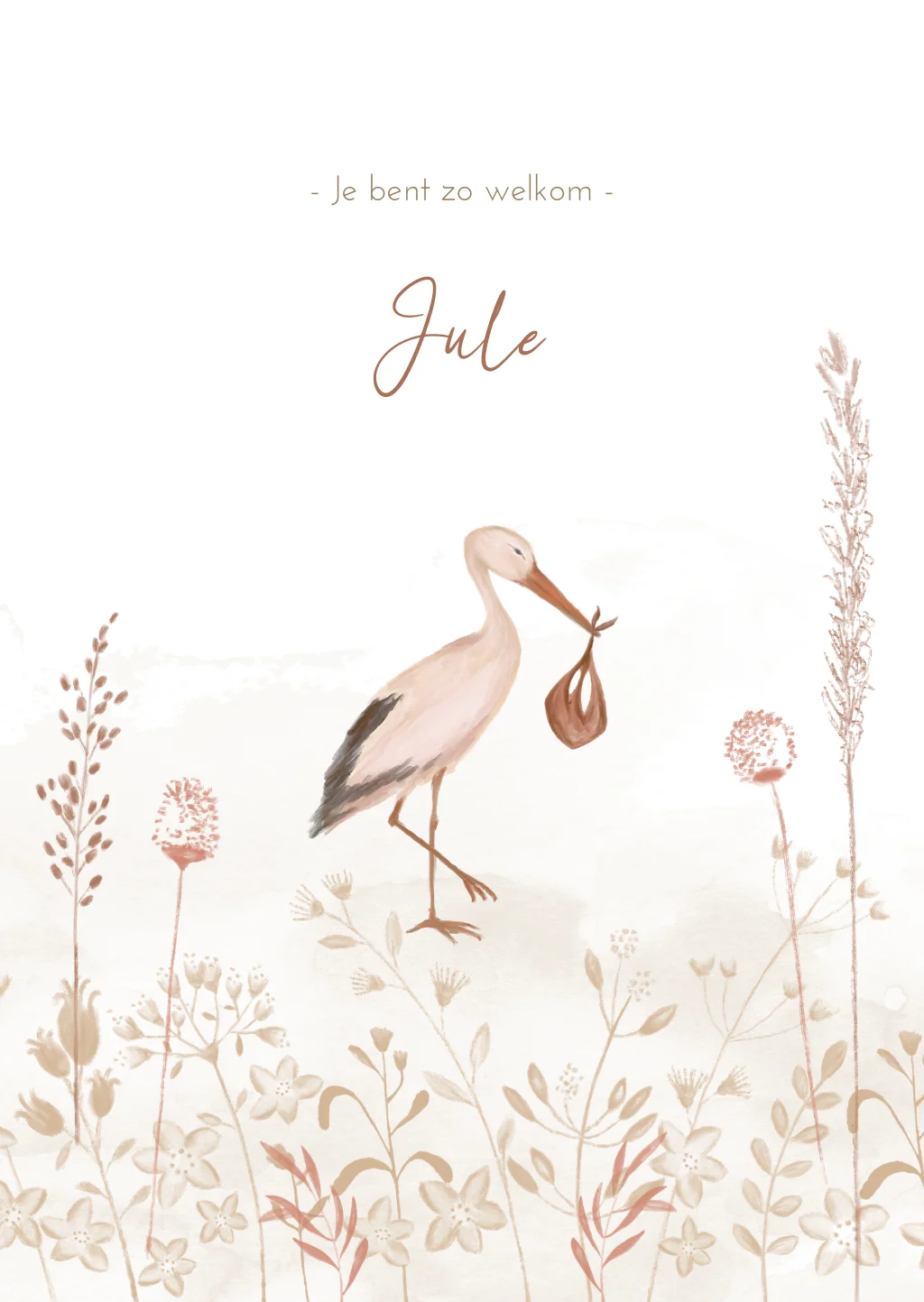 Geboortekaartje in tentvorm met illustratie ooievaar en waterverf