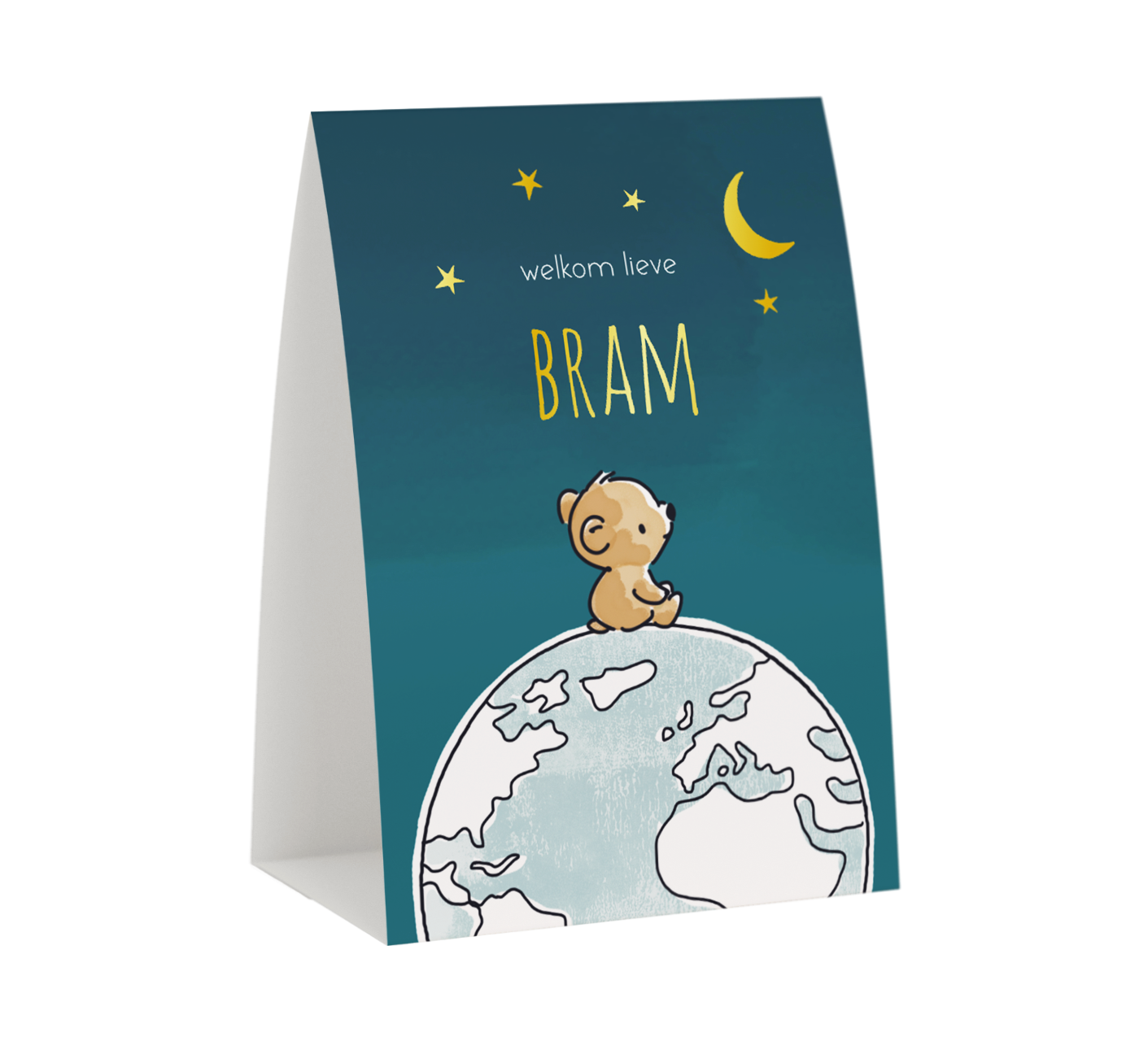 Uniek geboortekaartje in tentvorm met beer op wereldbol en goudfolie