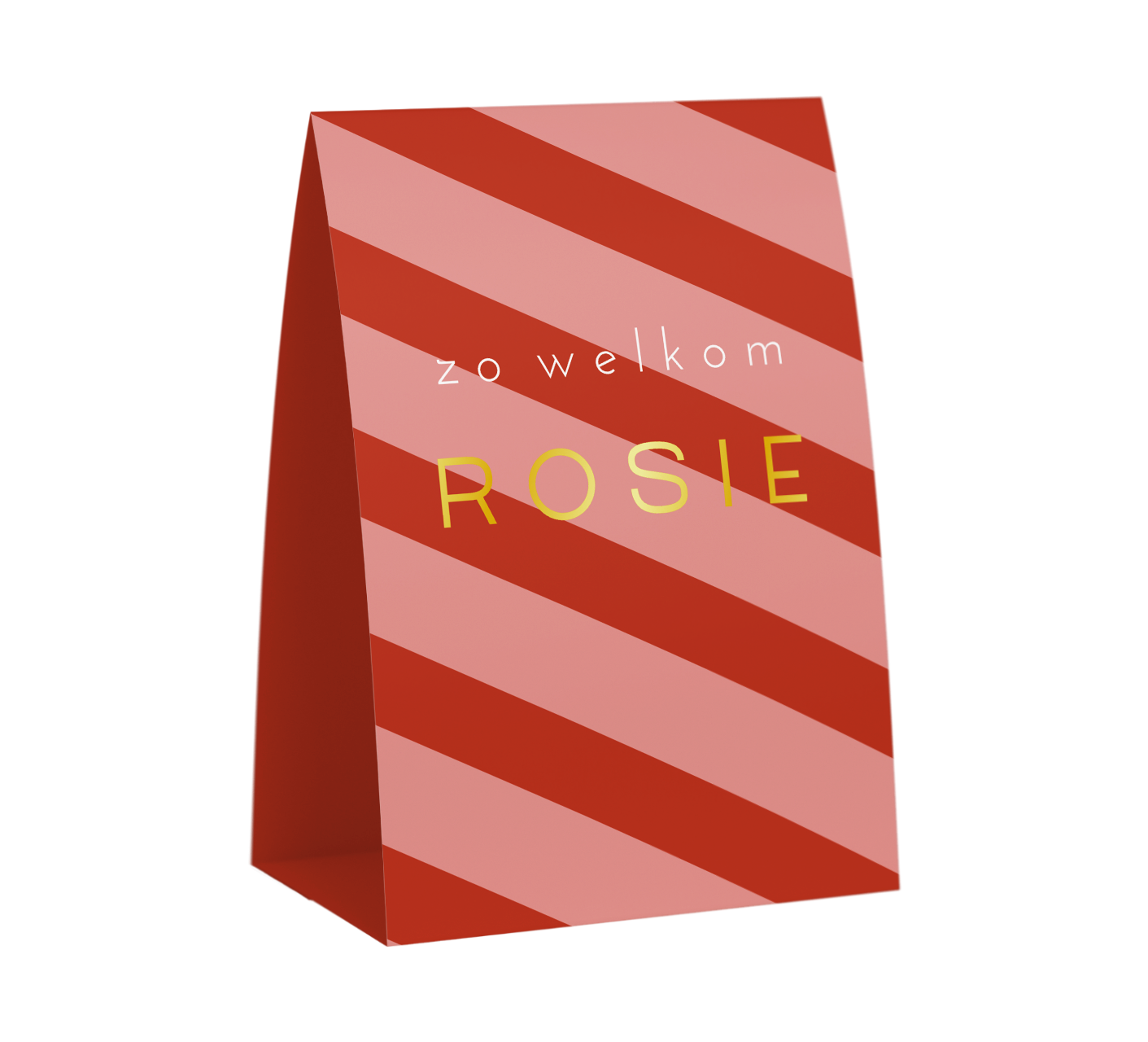 Dit is een vrolijk geboortekaartje in tentvorm voor je dochter. Op het kaartje staan afwisselend roze en rode strepen. De goudfolie naam geeft dit kaartje een luxe uitstraling. Pas het kaartje helemaal naar wens aan in onze online editor en bestel een proefdruk om dit kaartje in het echt te zien.