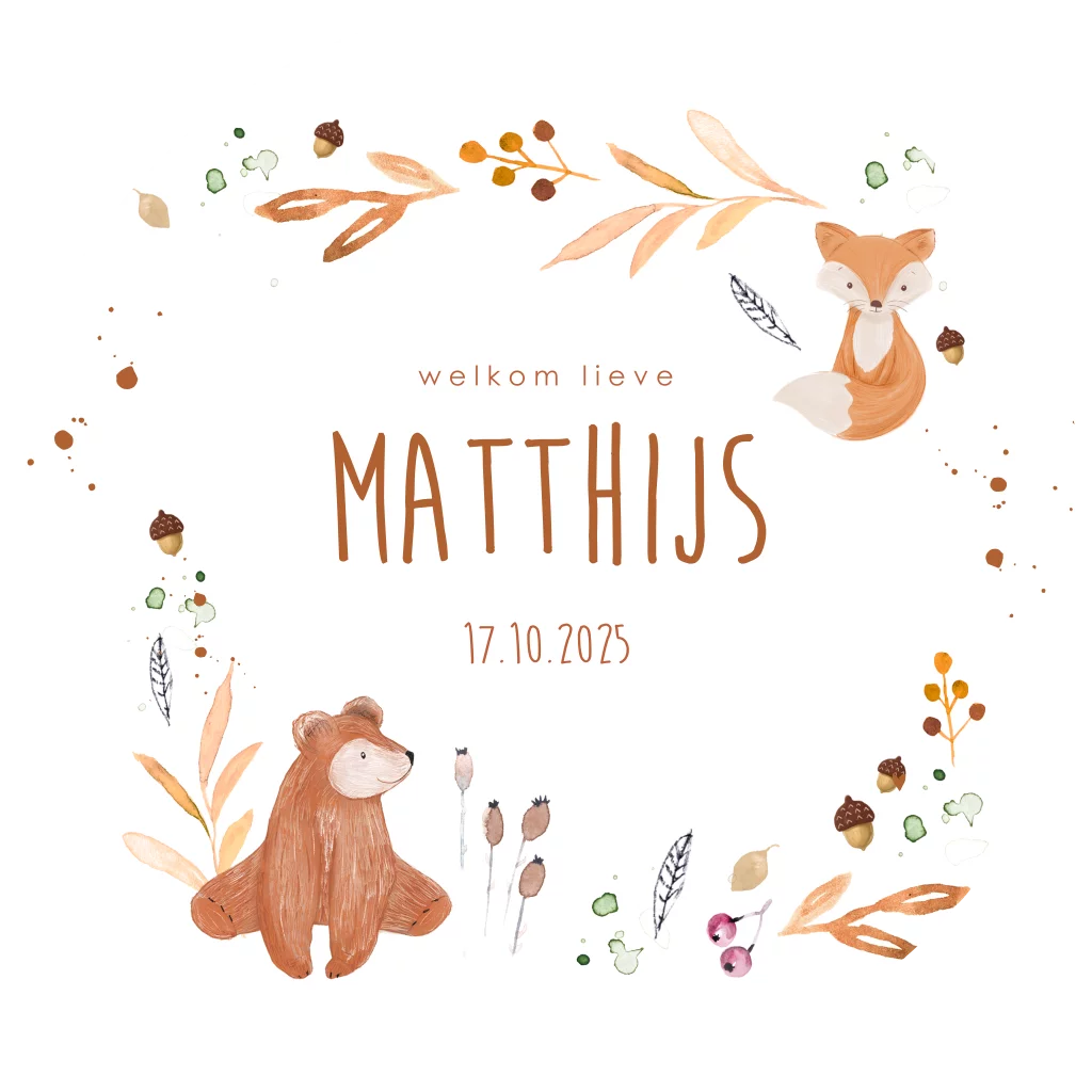 Kondig de geboorte van jullie zoontje aan met dit sfeervolle tuinbord. De getekende beer en vos worden omringd door takjes, spetters en eikels. Het tuinbord wordt geleverd zonder (houten) paal en bevestigingsmateriaal. Deze kun je zelf vinden bij de bouwmarkt. Je bevestigt het bord met schroeven aan de paal. Tip: Als het hard waait, zet het bord dan even binnen.