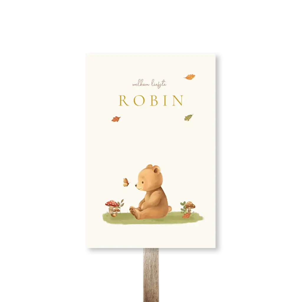 Lief tuinbord in herfstbeer met beertje en vlinder. Het bord is gemakkelijk aan te passen in de online editor. Het tuinbord wordt geleverd zonder (houten) paal en bevestigingsmateriaal. Deze kun je zelf vinden bij de bouwmarkt. Je bevestigt het bord met schroeven aan de paal. Advies: Als het hard waait, zet het bord dan even binnen.