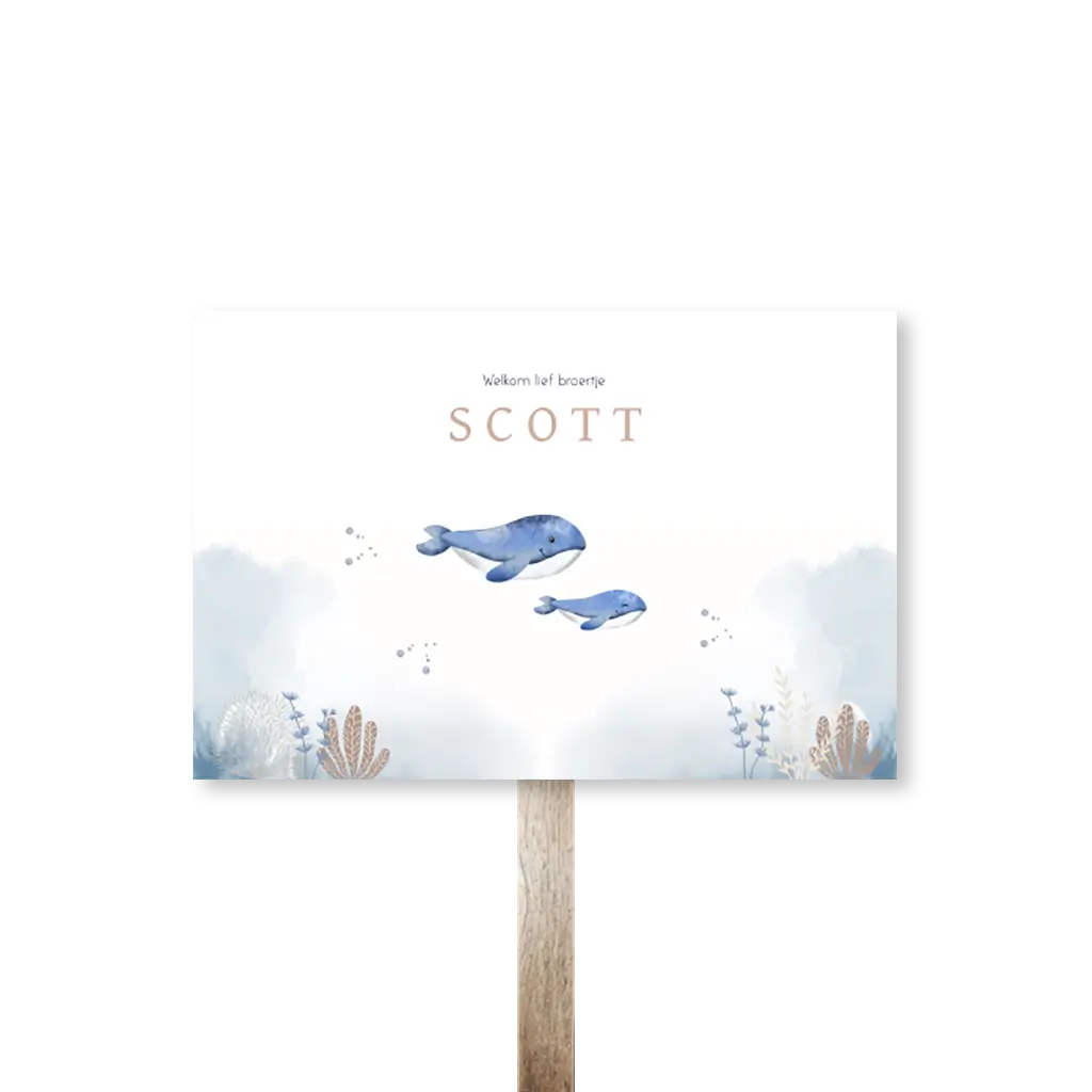 Een lief tuinbord passend bij het geboortekaartje. Het bord heeft blauwe watercolour en een illustratie van een walvis in de zee. Pas het ontwerp naar wens aan in onze online editor. Het tuinbord wordt geleverd zonder (houten) paal en bevestigingsmateriaal. Deze kun je zelf vinden bij de bouwmarkt. Je bevestigt het bord met schroeven aan de paal. Advies: Als het hard waait, zet het bord dan even binnen.