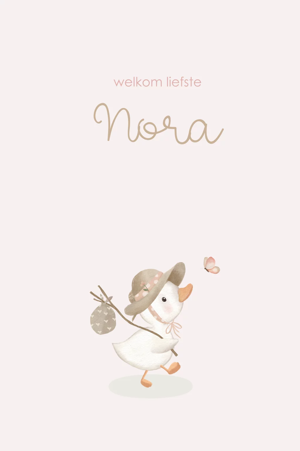 Een schattig tuinbord passend bij het geboortekaartje. Het bord heeft een lichte achtergrond met daarop een lieve illustratie van een eendje en vlinder. Pas het ontwerp naar wens aan in onze online editor.
