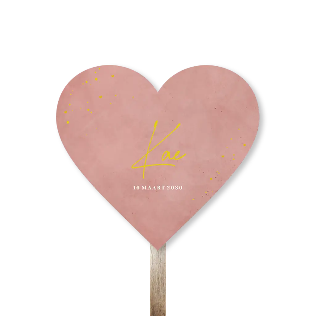 Kondig de geboorte van jullie kleintje aan met dit lieve tuinbord in de vorm van een hart. De roze velvet-look achtergrond staat mooi in combinatie met de goudkleurige spetters. Het bord is gemakkelijk aan te passen in de online editor.