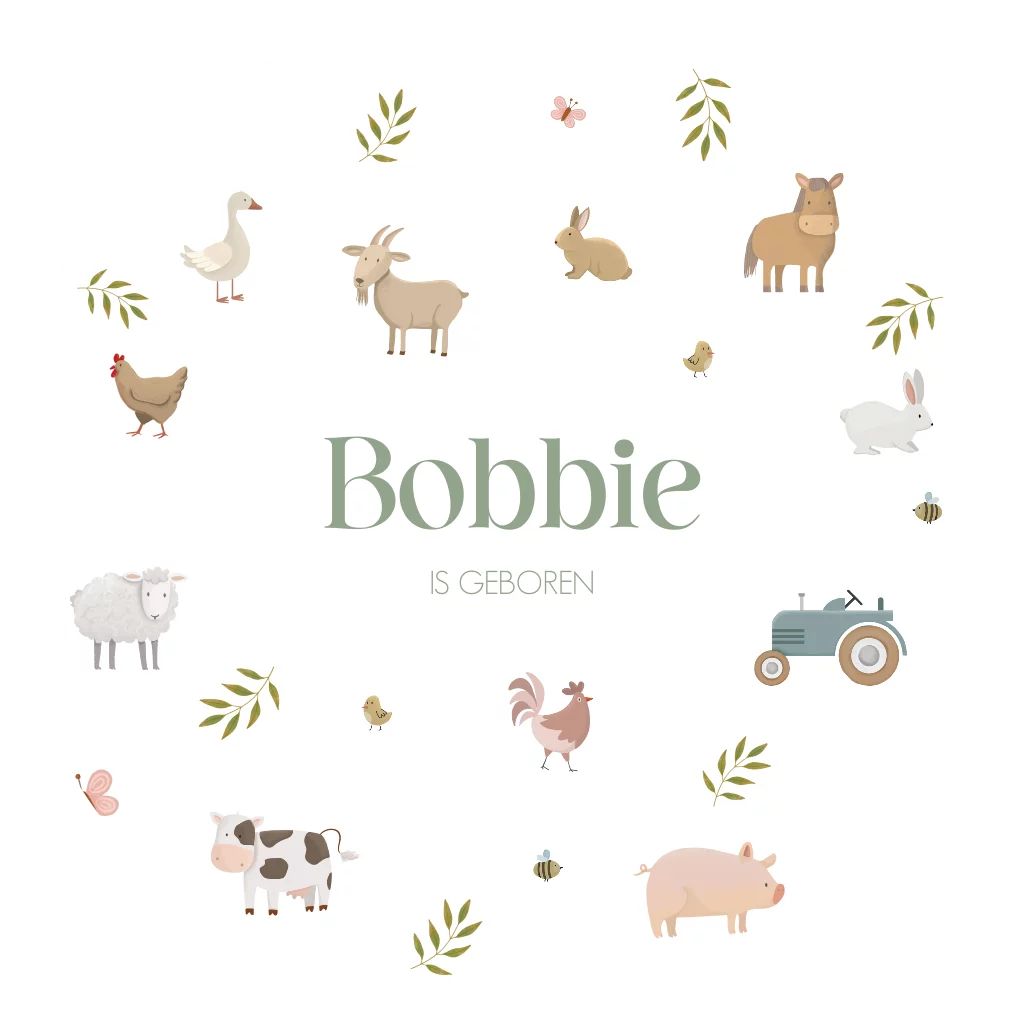 Een tuinbord met vrolijke illustraties van verschillende boerderij dieren. Helemaal in stijl van jullie geboortekaartje. Pas het ontwerp zelf naar wens aan.