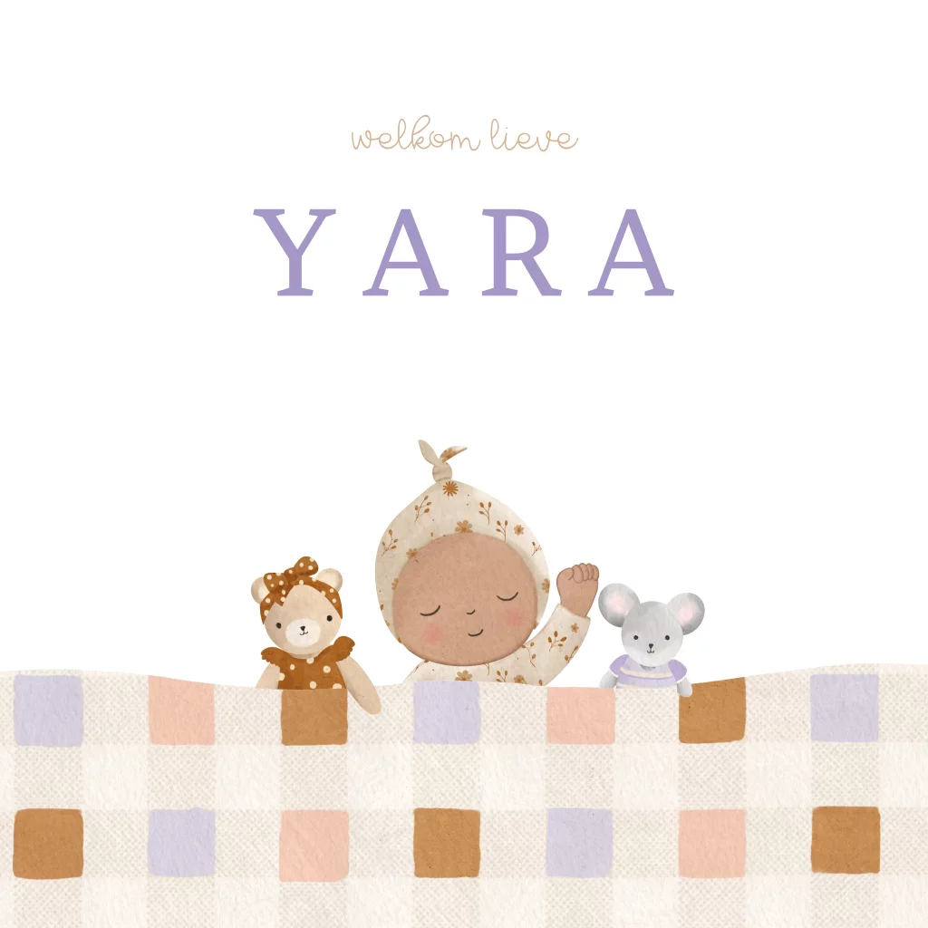 Wat een lief tuinbord! Dit bord heeft een illustratie van een meisje onder een dekentje met haar knuffels. Pas het ontwerp naar wens aan in onze online editor.