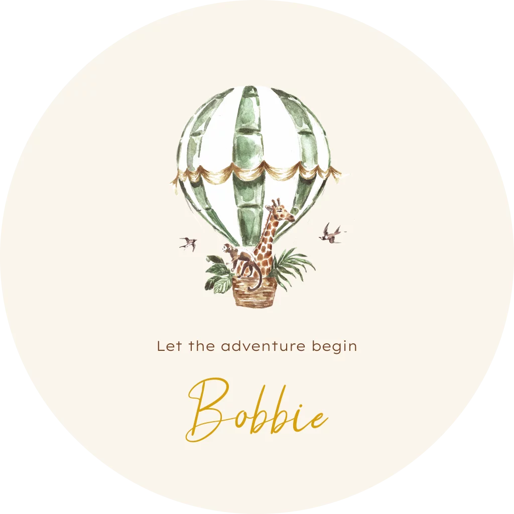 Kondig de geboorte van jullie kleintje aan met dit hippe tuinbord in de vorm van een cirkel. Het bord heeft een leuke illustratie van een luchtballon met jungledieren. Het bord is gemakkelijk aan te passen in de online editor.