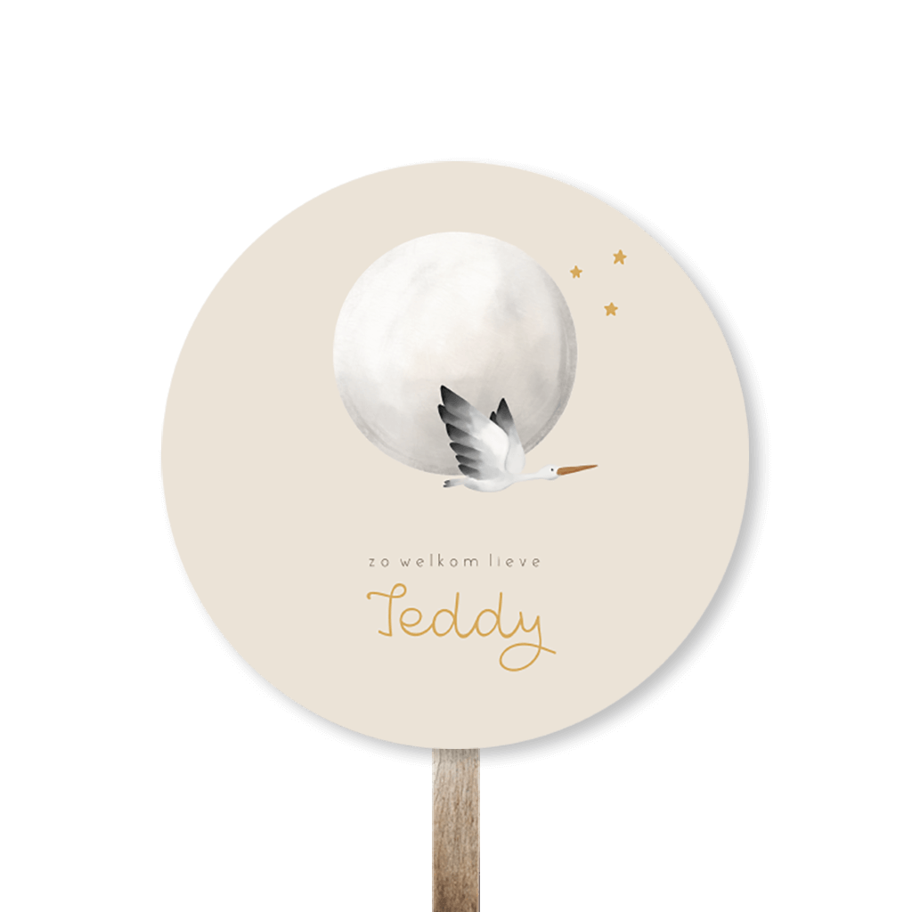 Je kleintje is geboren en dat mag iedereen weten! Op dit tuinbord is een vliegende ooievaar te zien met daar achter een watercolour maan en sterretjes. Het bord is helemaal naar wens aan te passen in onze online editor. Het tuinbord wordt geleverd zonder (houten) paal en bevestigingsmateriaal. Deze kun je zelf vinden bij de bouwmarkt. Je bevestigt het bord met schroeven aan de paal. Advies: Als het hard waait, zet het bord dan even binnen.