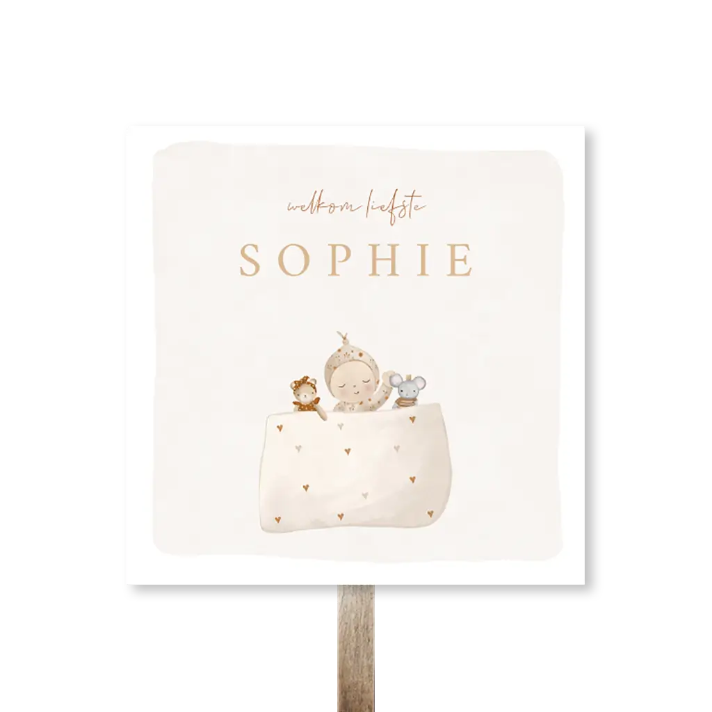 Een schattig tuinbord voor jouw kindje. Het bord heeft een beige kader met in het midden een illustratie van een baby onder een hartjes deken. Pas het ontwerp naar wens aan in onze online editor. Het tuinbord wordt geleverd zonder (houten) paal en bevestigingsmateriaal. Deze kun je zelf vinden bij de bouwmarkt. Je bevestigt het bord met schroeven aan de paal. Advies: Als het hard waait, zet het bord dan even binnen.