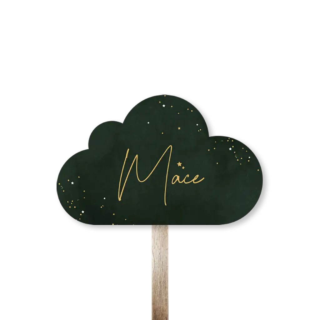 Kondig de geboorte van jullie kleintje aan met dit mooie tuinbord in de vorm van een wolk. De groene velvet-look achtergrond staat mooi in combinatie met de witte en goudkleurige spetters en sterren. Het bord is gemakkelijk aan te passen in de online editor.