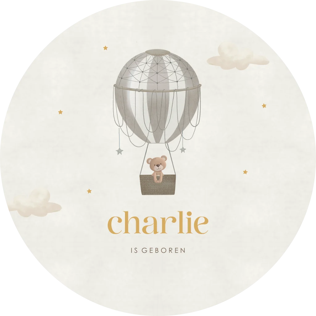 Kondig de geboorte van jullie kleintje aan met dit lieve tuinbord met een beertje in een luchtballon in de vorm van een cirkel. Het bord is gemakkelijk aan te passen in de online editor.