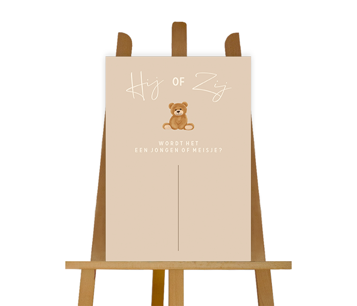 Welkom op de babyshower of gender reveal! Met dit invulbord kan je aan de gasten vragen of zij hun voorspelling willen noteren. Leuk. om na afloop te bespreken wat iedereen dacht en wat het daadwerkelijk wordt. Het bord heeft een beige achtergrond met daarop een lieve teddybeer. Pas het bord naar wens zelf aan.