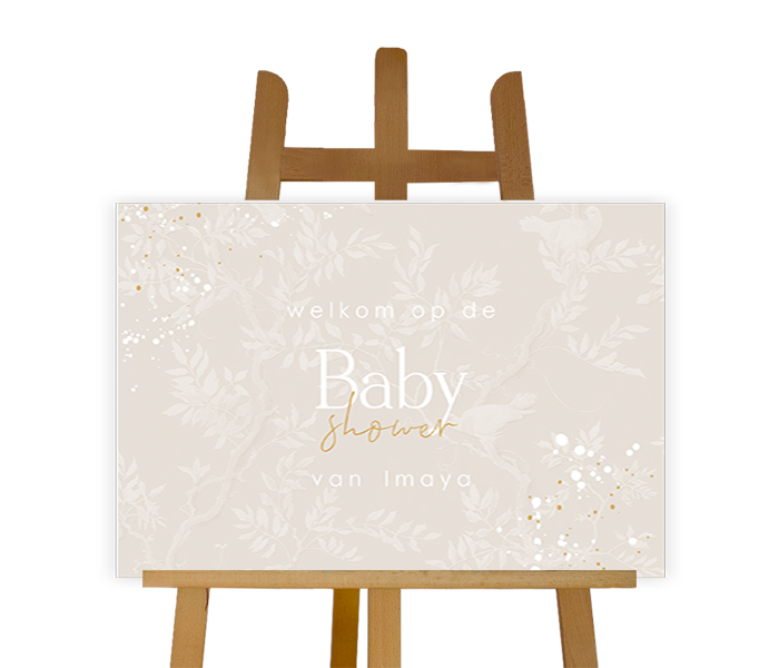 Organiseer jij binnenkort een babyshower? Heet de gasten en aanstaande mama welkom met dit lieve roze welkomstbord. Het bord heeft een klassieke stoflook in beige kleur. In de hoeken zie je verfspetters in het wit en goudkleur. Pas het ontwerp gemakkelijk aan in onze online editor.
