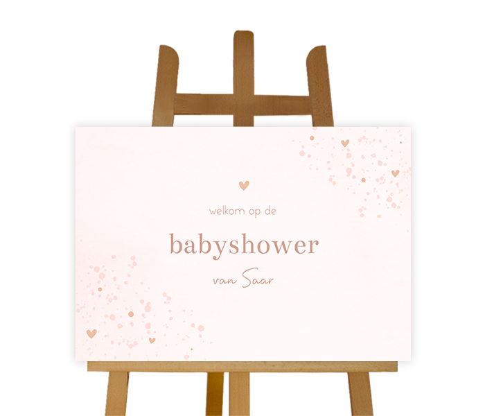 Organiseer jij binnenkort een babyshower? Heet de gasten en aanstaande mama welkom met dit lieve roze welkomstbord. Het bord heeft een lieve roze watercolour met verfspetters en hartjes. Pas het ontwerp gemakkelijk aan in onze online editor.