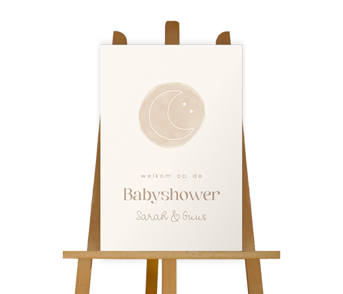 Organiseer jij binnenkort een babyshower? Heet de gasten en aanstaande mama welkom met dit leuke beige welkomstbord. Het bord heeft een illustratie van een maantje. Pas het ontwerp gemakkelijk aan in onze online editor.