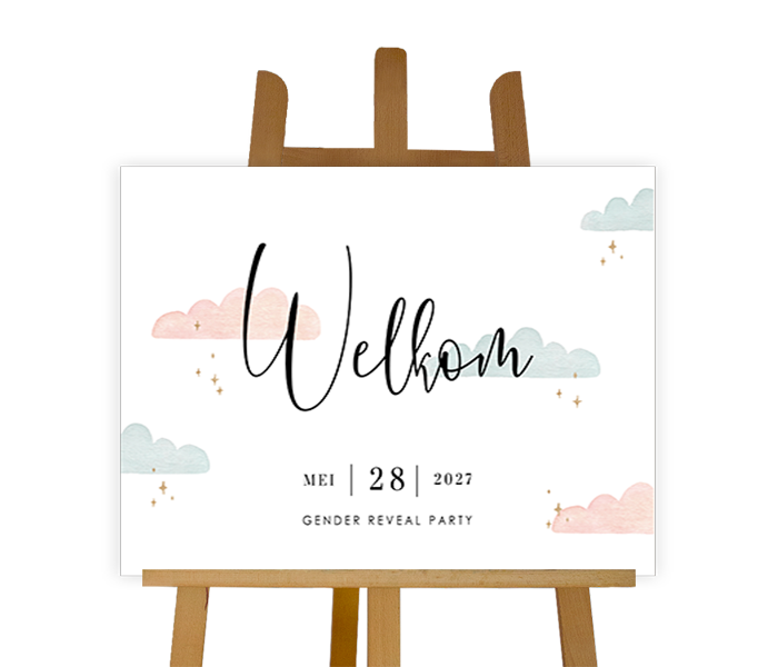 Welkom op de gender reveal! Met dit welkomstbord heet je iedereen van harte welkom. Het bord heeft een witte achtergrond met daarop blauw en roze wolkjes. Pas het ontwerp naar wens aan in onze online editor.