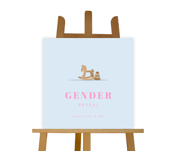Kondig de gender reveal van jullie toekomstige kindje aan met dit vrolijke uitnodigingsbord. Het bord heeft een lichtblauwe achtergrond. Op het bord zie je een speelgoed paardje en roze letters. Pas het bord naar wens aan in onze online editor.