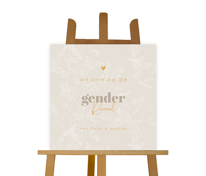Een stijlvol uitnodigingsbord voor jouw gender reveal. Dit bord heeft een klassieke en stijlvolle uitstraling door de stoflook achtergrond. Pas het bord naar wens aan in onze online editor.