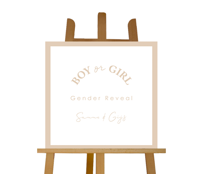 Welkom op de gender reveal! Met dit welkomsbord kan je de gasten goed welkom heten. Het bord heeft een beige kader met daarin de tekst 'Boy or girl?'. Pas het bord naar wens aan in onze online editor.
