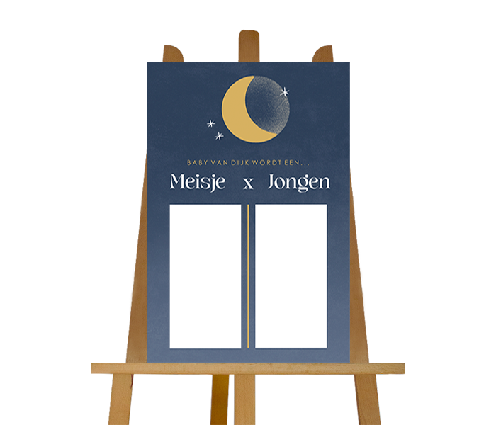 Welkom op de gender reveal! Met dit welkomsbord kan je aan de gasten vragen of zij hun voorspelling willen noteren. Leuk. om na afloop te bespreken wat iedereen dacht en wat het daadwerkelijk wordt. Het bord heeft een blauwe achtergrond met maantje. In het midden zie je een lijn voor de voorspellingen.