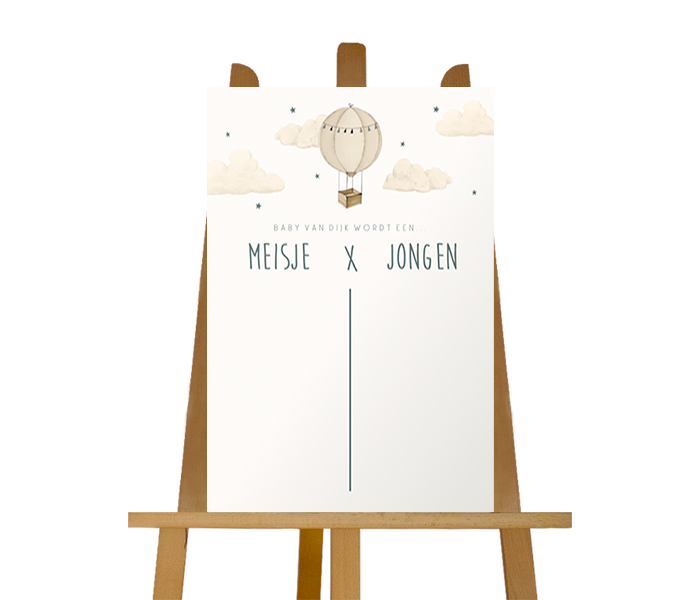 Welkom op de gender reveal! Met dit welkomsbord kan je aan de gasten vragen of zij hun voorspelling willen noteren. Leuk om na afloop te bespreken wat iedereen dacht en wat het daadwerkelijk wordt. Het bord heeft een prachtige illustratie van een luchtballon tussen de wolkjes. In het midden zie je een lijn voor de voorspellingen.