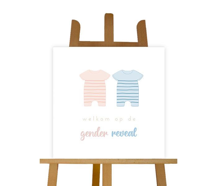 Organiseer jij binnenkort een gender reveal? Heet de gasten welkom met dit lieve en vrolijke welkomstbord. Het bord heeft twee lieve rompertjes in de kleuren blauw en roze. Pas het ontwerp gemakkelijk aan in onze online editor.