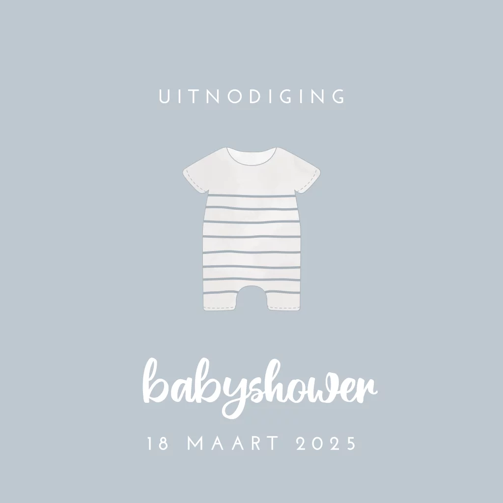 Organiseer jij binnenkort een babyshower? Nodig de gasten uit met deze leuke uitnodiging! Het kaartje heeft een blauwe achtergrond met daarop een schattig rompertje. Het ontwerp pas je gemakkelijk aan in de online editor.