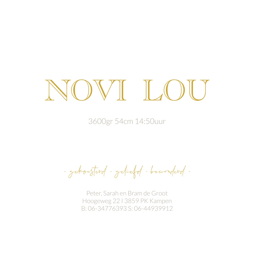 Een stijlvol geboortekaartje voor jouw kindje. Het kaartje heeft een beige achtergrond met marmer-look. De naam en geboortedatum wordt gedrukt in goudfolie. Pas het ontwerp naar wens aan in onze online editor.